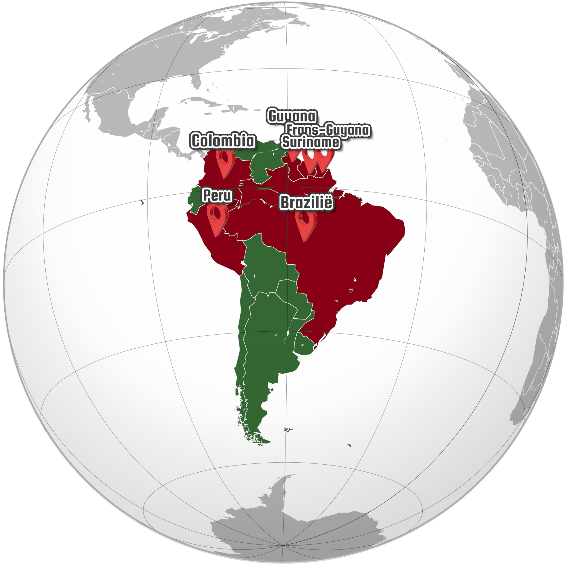 Landen: Colombia, Guyana, Suriname, Frans-Guyana, Peru en Brazilië.