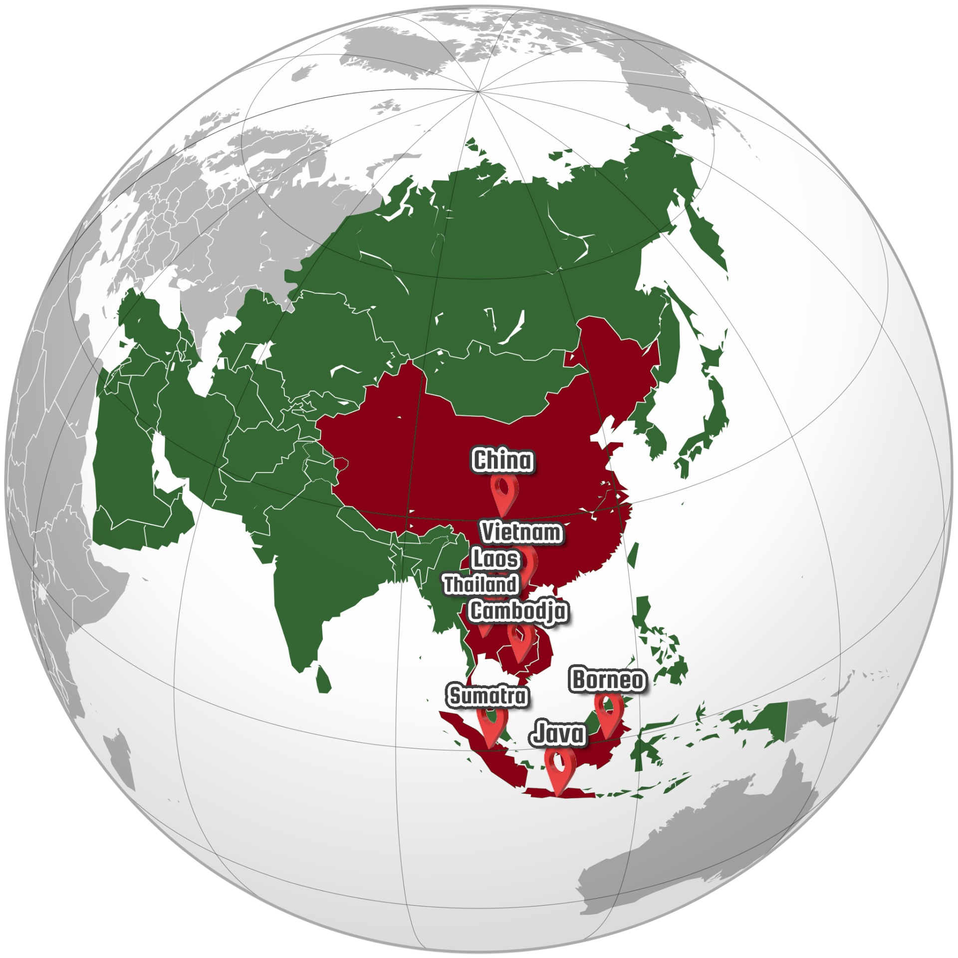 Landen: China, Laos, Thailand, Cambodja, Vietnam en Indonesië (Borneo, Java en Sumatra).