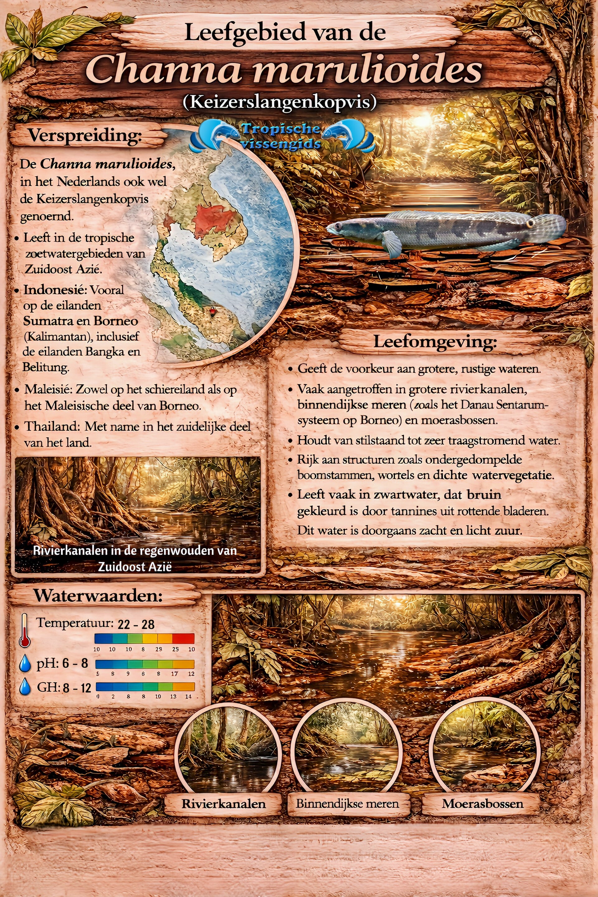Leefomgeving: De Channa marulioides, in het Nederlands ook wel de Keizerslangenkopvis genoemd, leeft in de tropische zoetwatergebieden van Zuidoost-Azië. Deze indrukwekkende roofvis staat bekend om zijn camouflage en vermogen om in uiteenlopende watercondities te overleven.